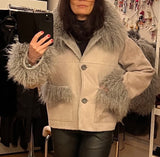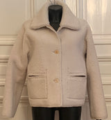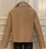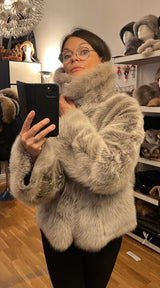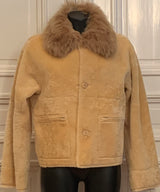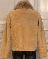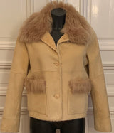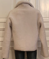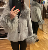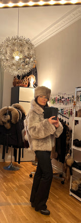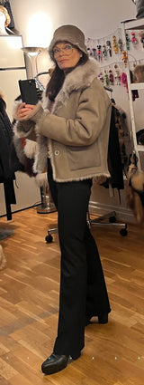 Vändbar lamm skinns jacka handsydd i Stockholm av Amoress Stockholm. Finns i beige fårskinn med vit insida, ljusgul, lejongul, ljusgrå och taupe. Fickan är sydd med blixtlås på ena sidan, så att innehållet i fickan inte åker ut, när du vänder jackan in och ut. Leveranstiden är 1-2 veckor beroende på vart den ska skickas till.