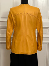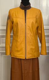 Den här fina gula skinnjackan i storlek M har en fjäder målad på ena ärmen och är helt unik i sitt slag. Amoress Stockholms sömmerska har gjort den, så som mycket annat. Den är gjord här i Stockholm och den är i den finaste lammnappa kvaliteten, med dubbelgående dragkedja, för ökad flexibilitet.