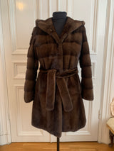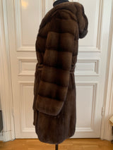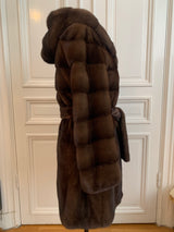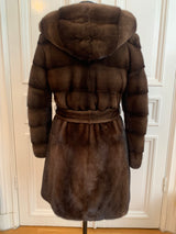 Mink jacket with hood and belt. This mink fur is 90 cm long. It is made in Italy from the best female mink skins bought at the Copenhagen Fur Auction or at auction in Finland SAGA Mink. The mink skin lies in two different directions, partly horizontally and partly vertically. We guarantee that it is of the best quality and that you will be satisfied and get a lot of use out of this fine fur for the rest of your life. If You would like this fur in another color or length please send me an email to info@amoress.se and I will check it for You, but there might be another price as well, so You are prepared for that. Approximately delivery time is 3-4 weeks. The delivery time will be longer around Christmas and New Year, because of all the holidays.